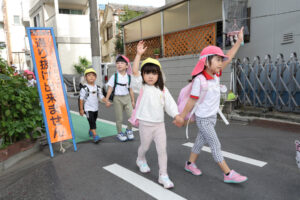 保育園を出発!!ウキウキ♡ワクワク、公園への足取りも軽くグングンと進みます。ちゅうりっぷ組とはいびすかす組で手を繋いで歩きました。道路を渡るときは左右を見て手を挙げて渡ります。はいびすかす組さんがお手本となってくれました。