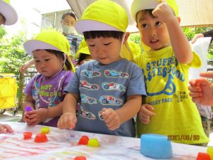 2歳児クラス(りす組)では、園庭にテーブルを出して青空の下、色氷のお絵かきをしました。